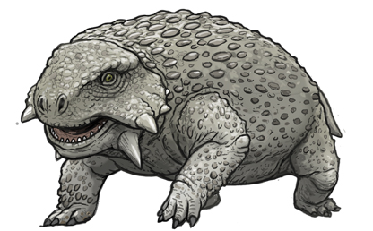スクトサウルスと同じくパレイアサウルス類の 仲間に分類される原始的な爬虫類です。 体は骨質のスパイクに覆われ、頬には板状の突起物が あり、頭骨の大きさは60cmもあります。 大きく丸い重厚な体型は硬い植物を消化するための 大きな内臓が納めるためだろうと考えられています。 |