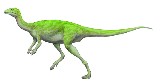 南アフリカの2億1000万年前(三畳紀後期)の地層から 化石が発見された初期の恐竜です。小型の原始的な鳥脚類で 脚は長く、捕食動物から逃げるために速く走れたといわれ、 エオカーソル(暁のランナー)と名付けられました。 葉型の歯をしており、植物を食べてたといわれています。 |