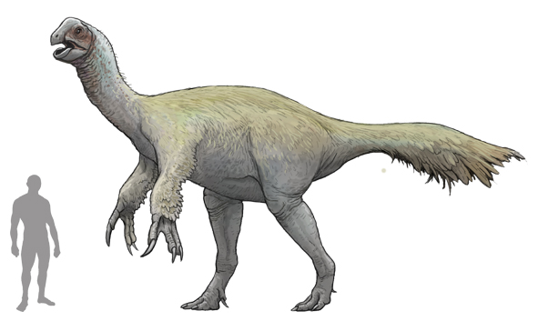 2005年4月、中国の内モンゴル自治区で日本のテレビの 撮影時に8500万年前の地層から化石が発見されました。 オビラプトルや インゲニアなどの小型の獣脚類である オビラプトロサウルス類の仲間ですが、全長は8mで 推定体重が1.4トンとかなりの巨体で、この仲間では 最大種になります。(イラストは軽トラックとの大きさ比較図) アゴにはクチバシがあり歯はなく、長い前脚をもっていました。 化石からは羽毛の痕跡はありませんが、前脚は翼状で、 羽毛があったと考えられています。