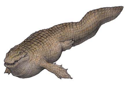 海生ワニの中には巨大化したものもいる。ホエールクロコダイルはその一種だ。 体はヘビのように細く、外見的には バシロサウルスのように見える。 体をくねらせて泳ぎ、魚やイカ、 ドルフィンリザードをとらえて食べる。 陸に上がるのは産卵の時だけで一生を海中で過ごす。鼻の穴は クジラや イルカ と同様、頭の上に移動した。性質は極めて獰猛。寿命は80年程。 (解説 / クロチャン ) |
