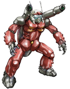 「ランダーエイピートル」の 系統から比較的初期に分化した種類で、ランダーの肩の部分に あたる2対の脚の関節部分にやすり状の発音器官があり、 ここをスライドさせて音を出す事ができる。 その中でも本種は特に発音器官が発達しており、大きな音を 出す事に特化している。 肩の部分の2対の脚は前方を向いた砲塔のような形に変化しており、 根元の関節にはやすり状の発音器官を持つ。 本種の特異な点はここからで、内部が空洞の共鳴室となっていて 音を増幅・丈夫な弁の間を通し砲口から音波を放射する。 そのため音波は前方に強力な指向性を持ち、小型の昆虫や脊椎動物が 至近距離で浴びると失神する事もある。 この武器は狩りや外敵への反撃に使われるほか、繁殖期にはオス同士 の威嚇ディスプレーにも使われる。 ただしこの発音器官が邪魔になるため、飛翔力や活動範囲は ランダーより劣る。 両肘に耳を持ち、外骨格の突出部は哺乳類の耳介のように音を 集めて鼓膜に伝える役割を持つ。 また「砲撃」時は腕を伸ばしてこれで耳を塞ぎ、自分が放った 音波でダメージを受けるのを防ぐ。 又広い視界を確保するため、左右の複眼が大きく中央で合わさって いるのも特徴。外敵をいち早く察知する能力に長けた種と言える。 ( 解説 / 鋼の翼 )