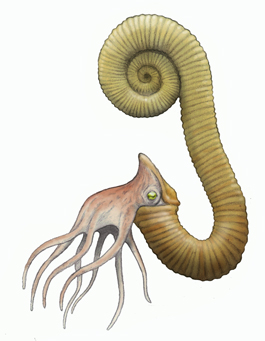 およそ1億1000万年前に生息したアンモナイトの仲間です。 殻は平面巻きですが、成長途中でその巻きはほどけて、 最後はU字フックのような形に成長しました。 最初の平面巻き部分が浮きとなり、U字フックの部分が 下方になった姿勢で海中を泳いでいたと考えられています。
