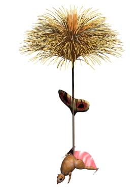 ふんわりと空気抵抗が高くなるような尾の先端の毛により、 上昇気流の発生する山岳地帯の崖の辺りにパラシュータは適応した。 弾力のある木の枝をうまく利用して飛び上がると、気流にのって 2時間ほど浮遊生活を行い、虫などを捕らえて食べる。 尾の中ほどにあるフィンと後ろ足と胴体の間の皮膜によって、 ある程度方向転換も自由に行うことができるが、その生活は 基本的に風任せである。 フィンの部分には、大型の捕食鳥類を驚かせるような模様があり、 これによって身を守っている。 (解説 / オパビニマニアJ ) |