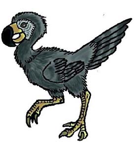 熱帯雨林が減少し草原に変貌するなか、インコの子孫である このラリュギュウスはその草原に生活の場を変えた。 人類時代の草原では脚の速い有蹄類や レアなどがパラダイスだったが、 これらは子孫を残せず絶滅し、代わりに草原に定着したインコたちである。 その翼は小さくなり飛ぶ事に機能しなくなった。体は豊富な餌のおかげで 巨大化して体色はジャングルに居た頃とは異なりカラフルではなく 草の色に溶け込めるよう地味な灰色となった。 性質は基本的にはおとなしく友好的だが繁殖期にはオスは気が荒くなり、 メスの奪い合いの際に相手を蹴り殺す事がある。 植物食で穀物を刈り取ったり硬い木の実を割ったりして食べるが餌が 不足すると動物の死体を食べたりもする。 足は祖先と同様器用でものをつかんだり出来る。 (解説 / ピエロ ) |