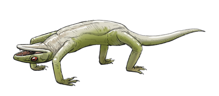 エクソシスドンは最初、頭骨と背骨の化石が見つかっており、 背骨が異様に反っていたが、これは背中の靭帯が縮んで反ったと 考えられていた。しかし、後に足の化石も発見され、四肢とも関節が 逆に曲がっていたため、これは腹の方を天面にして歩いていた つまり、ブリッジ状態で歩行していたのではないかという説まで 出てきて論争が巻き起こったそうです。この説が正しければ、 おそらく、ブリッジしたまま、階段を降りたりできただろう。 |