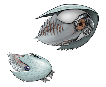 カナダの5億1800万年〜5億500万年前に生息した アノマロカリスなどのラディオドンタ類の1種です。 頭部はカブトガニのような幅広い甲皮があり、 当時の三葉虫のように底生生活をしていたと見られています。 |