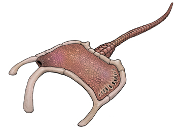 硬い板状の外皮をもっており、この奇妙な動物はヒトデや ウニなどの棘皮動物です。体のつくりが左右対称でもなく、 また刺皮動物の特徴である五放射相称でもなかったようです。 微生物などを口で吸い込んで食べた濾過食性の動物だった と考えられています。 |