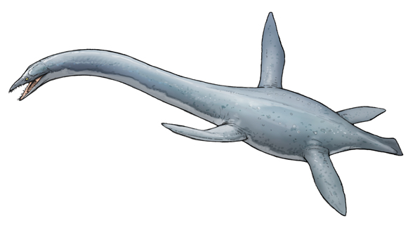 北アメリカ大陸の中央部に入り込んでいた内海に棲んでいた海生爬虫類 です。同じ仲間のエラスモサウルスと同じく首が異様なほど長く、 体長の約半分を占め6mもの長さでした。 また首の骨(頚椎)の数が63個と多いため首はしなやかに動いたようです。 頭部は小さく下顎には大きな尖った歯が30本ちかく並んでおり、 魚やイカの仲間など捕食していました。